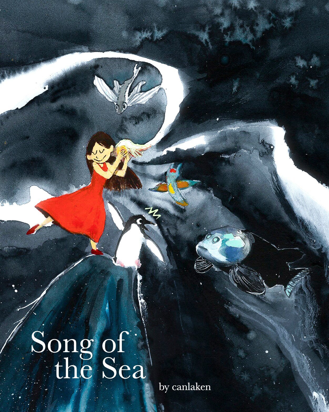 A young girl named Hope listens to the Song of the Sea from a conch as a Adélie penguin tries to nudge her upon having eye contact with a Barreleye, a deepsea fish which has a intriguing transparent head to allow more light in to hunt and protect its sensitive eyes from the stinging siphonophores.