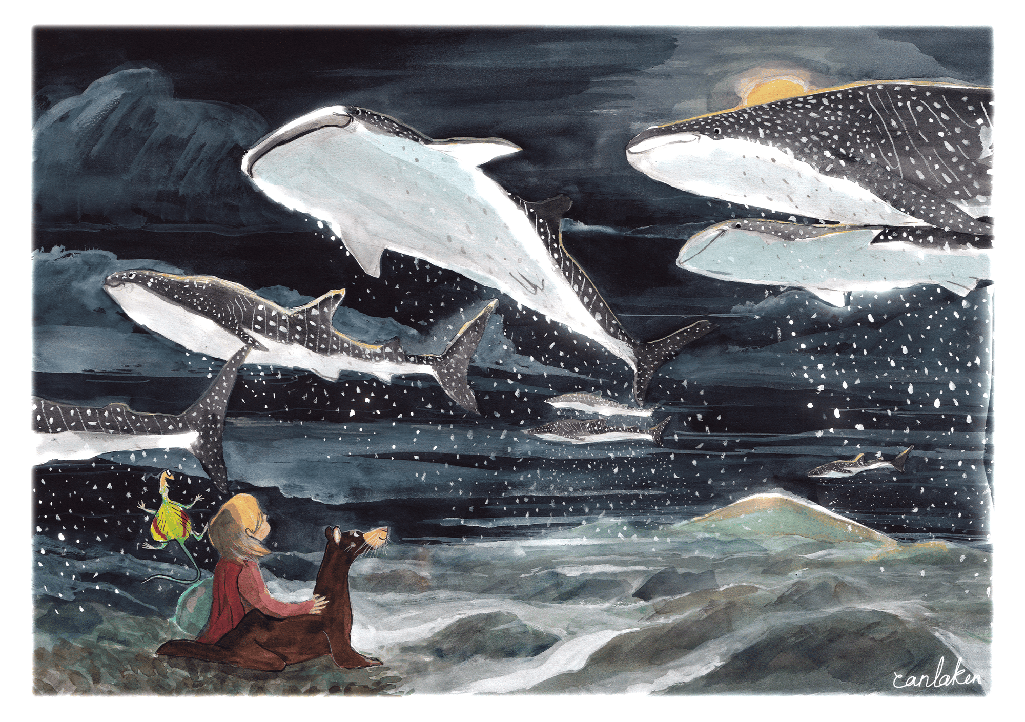 It features the whalesharks raining snow from the skies above the rainforest canopy as Lynn (the girl) sits with her friend Draco and Ottie the Otter Civet.